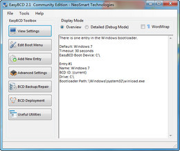 EasyBCD能够极好地支持多种操作系统与Windows 7、Vista结合的多重启动,包括Linux、 Mac OS X、 BSD等,当然也包括微软自家的Windows 2000/XP。任何在安装Windows7前其能够正常启动的系统,通过EasyBCD,均可保证其在安装Windows7后同样能够启动。同时,在设置方面极为简单,完全摆脱BCDEdit的繁琐冗长命令,用户只需选择相应的平台与启动方式(如Linux下的Grub或LILO),即可完成。