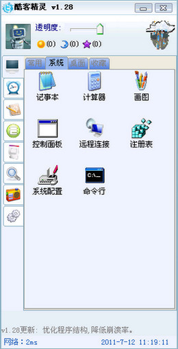 酷客精灵是一款高性能系统辅助软件,它运行速度快,消耗内存不超过3M。界面美观,结构简洁,便捷收放,功能实用,能够为日常的电脑使用带来很大的便捷。
