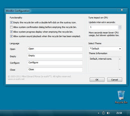 Windows 回收站的作用就像办公室的垃圾筒,只是我们喜欢把它放在角落里,而Windows却把它放在了桌面上。使用MiniBin这个小工具就可以将回收站放在系统右下角的托盘区域,保持桌面整洁。你可以在这里对回收站进行打开、清空等操作,MiniBin自带了两款主题风格,你也可以根据自己的爱好定义MiniBin的图标。