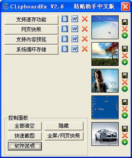 粘贴助手 ClipboardEx 是 Clipboard Extension 程序,是便捷的剪贴板扩展工具。ClipboardEx是真正的绿色系统编程,无修改注册表,单机版绝无网络连接,系统安全可靠;软件不需安装即可执行,并支持网页快照,截图,以及图像和文字快速存储,使用方便快捷。