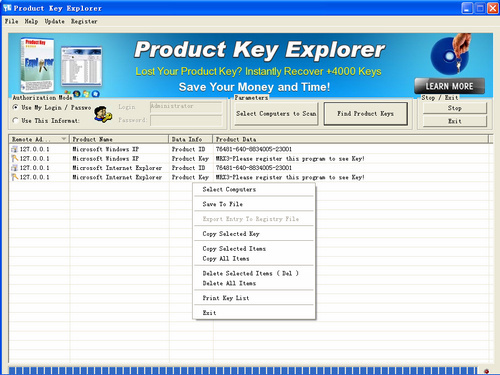 Product Key Explorer是一款程序密钥显示工具,可以查看电脑中已经安装的程序所适用的密钥或序列号,支持 Windows、Office、SQL 等超过100 种程序,同时也可以查看远程电脑中的注册信息。