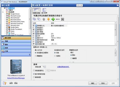 专门用来对标题栏中的图标进行更改的,没想到吧。通过使用这一工具,你可以为普通窗口标题栏增加“小化至系统托盘”和“总在上面”两个特殊的按钮。