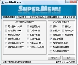 XP超级右键,是一款实用的右键菜单管理工具,功能强大!可以在右键上自定义增加/删除菜单、自定义增加图片美化菜单.软件自带了常用的菜单选项,直接选择就可以使用。