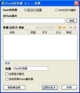 如果您有一个需要载入很多文件(SWF,图片,声音等)的Flash文件(SWF),如果您有很多的Flash并希望他们能够顺序播放。Flash 打包器可以帮助您将这些文件打包成为一个单一的EXE Flash播放器方便您的传输。您可以用它将一些SWF实现的相册和他所需要的照片放在一个EXE文件中;您也可以精选一些SWF影片生成一个按您预订的顺序播放的EXE文件发送给您的朋友。