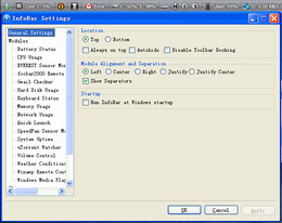 InfoBar是桌面快速启动器或者Dock的替代品,能够作为系统资源监视器,监视各种硬件状况。而自带的皮肤则可以和xp、vista、windows7融合在一起。InfoBar带有许多任务栏才具有的属性。比如,可以在不使用的时候自动隐藏,显示在桌面顶部或者底部(目前还不能自由拖动),一直处于置顶状态,不会被遮盖。