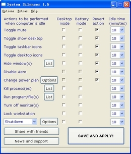 可以让系统闲置的时候自定义运行一些任务,例如设定离开30分钟后自动开启迅雷下载,自动播放音乐,可以设定静音,隐藏任务栏图标,终止进程,运行程序等动作。其实就是定时类的工具,System Silencer算很有创意的一款软件,使用System Silencer可以充分利用你系统闲置时间。