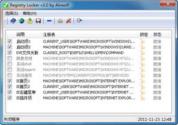 Registry Locker是一款人性化的注册表锁定工具,相比直接禁用注册表,这个更加人性化。主要用于锁定系统注册表指定项目,使之无法被病毒或者其它软件更改,以维护系统的稳定性,适用于干净的已装完各类常用软件的情况下使用。 软件自身内置了十余项易被各类病毒感染的注册表的位置,通过锁定这些项目,可以很方便的阻挡各类病毒的扩散和入侵。列表文件可以自行修改以适应自己的需要。