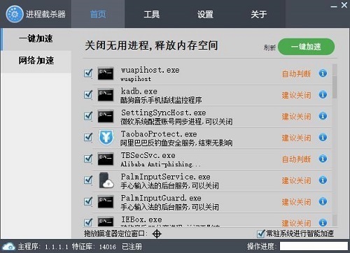 进程截杀器可以帮助您优化您的电脑。只要点击“一键加速”就会同时清理占资源的程序及内存;而qq,office等常用软件会智能忽略;占用资源的软件才会被关闭。勾选常驻加速后会智能调整优先级来让您感觉更流畅。值的一提的是它还具备网络加速、时间校对等功能;更是能够帮您找出可恶的弹窗所在的进程