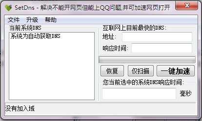 SetDns是一款用于加速网页浏览的DNS优化软件,他是绿色单文件的,可以解决只能上QQ不能开网页的问题,同时可以加快网页访问速度,与彗星DNS优化器不同的是,对域用户做了特别的设计,防止出现优化DNS后无法登陆到域的情况
