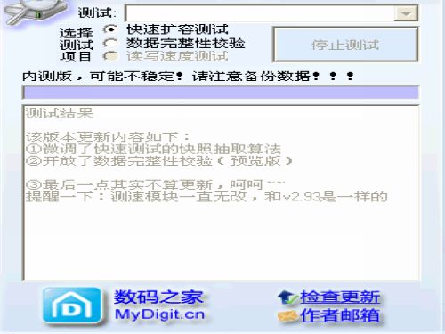 一款U盘/SD卡/CF卡等移动存储产品扩容识别工具。可以方便的检测出存储产品是否经过扩充容量,以次充好。还可以检测FLASH闪存是否有坏块,是否采用黑片,不破坏磁盘原有数据。并可以测试U盘的读取和写入速度,对存储产品进行老化试验。是你挑选U盘和存储卡必备的工具。在检测前请自行备份U盘/SD卡内的文件资料,以防万一。