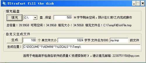 可以瞬间填满磁盘空间和释放磁盘空间。可以快速在自定义位置生成指定数量和指定大小的文件。速度超乎想象,无论你的硬盘有多大,0.3秒之内即可将其填满。