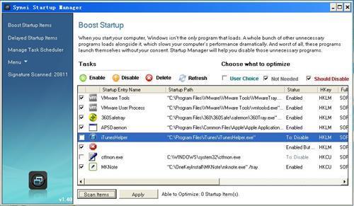 我们知道,不必要的开机启动程序太多的话,通常会影响启动速度。Synei Startup Manager是一个智能的开机启动程序管理器,它内置了一个“非必须启动”的应用特征库,可侦测超过16000种非必要的启动程序,并且可以自动将其禁用。