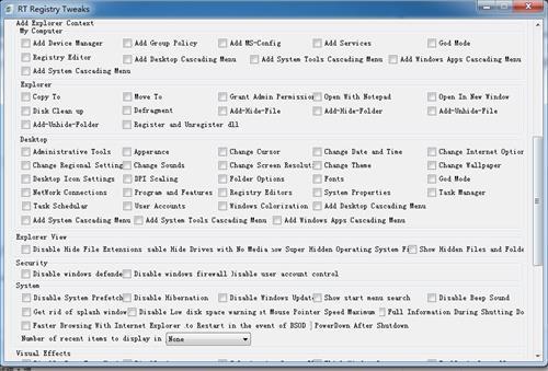 RT Registry Tweaker是实用的Win7系统注册表调整工具,软件提供了很多的注册表隐藏项目,并将其罗列在一个界面当中,只需勾选即可开启相应的功能。