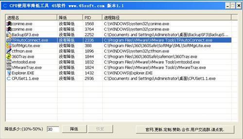 可以设置某个进程的CPU使用率,假如你是双核机器,某个进程使用率50%,再用本软件降低50%,那么再用任务管理器看的话就是25%,本软件对游戏支持良好,可以优化大部分游戏,而且效果明显,设置范围10%-50%,如果对游戏降低的话,cpu会降低很多,FPS会降低一点,非常适合大量多开的游戏或程序,CPU降低后能多开的更多。