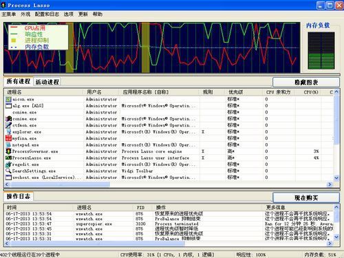 一款独特的调试级别的系统优化工具。主要功能是动态调整各个进程的优先级并设为合理的优先级类以实现为系统减负的目的,此项特性被Process Lasso定义为过载抑制(out-of-control restraint),可有效避免蓝屏、假死、进程停止响应、进程占用 CPU 时间过多等症状。同时它还具备前台进程推进、工作集修整、进程黑名单等附加特性。使用提示:软件为多国语言免费版,安装时在“Please select a language”处选择“Chinese(Simplified)”,即可使用简体中文界面。此外,家庭和学生用户可以免费使用本软件,但在使用14天后,用户可能偶尔遇到是否购买专业版的提示,若不需要,稍等片刻点击继续即可。