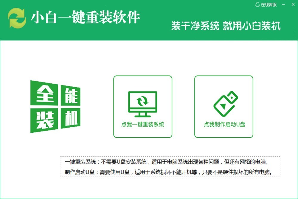 全新的一键在线重装和U盘启动盘制作工具,使用无需安装,无需U盘,更不需光盘,系统镜像采用云高速同步下载,真真正正抛掉一切的一键重装,即使无任何电脑基础也能快速重装系统。支持xp系统下载安装Win7系统或Win8系统,Win7系统下安装xp或Win8系统,Win8系统下安装Win7系统等,让重装变得更简单、更快速、更安全,需要的朋友赶紧下载使用吧,在线一键重装系统工具软件功能,告别繁琐,简单易用 不需要任何技术基础,傻瓜式一键重装,全自动完成,完全不需要光驱和光盘,是小白必备的重装神器;安全高效,性能稳定 郑重承诺:系统不黑屏、不蓝屏,无病毒,无死机,绝对安全、可靠、稳定、快速;智能装驱动,全面兼容 集成国内最全驱动库,精准识别硬件设备;智能检测、自动安装、设备即时生效;飞速下载,快速安装 采用智能云模式+迅雷7内核,实现了系统的快速下载,完美的Ghost技术,实现了系统的快速安装;系统随意换,一机多系统 完美支持XP/Win7 32位/Win7 64位/Win8 32位/Win8 64位/win10/win11系统互相转换,安装系统更加简单便捷。