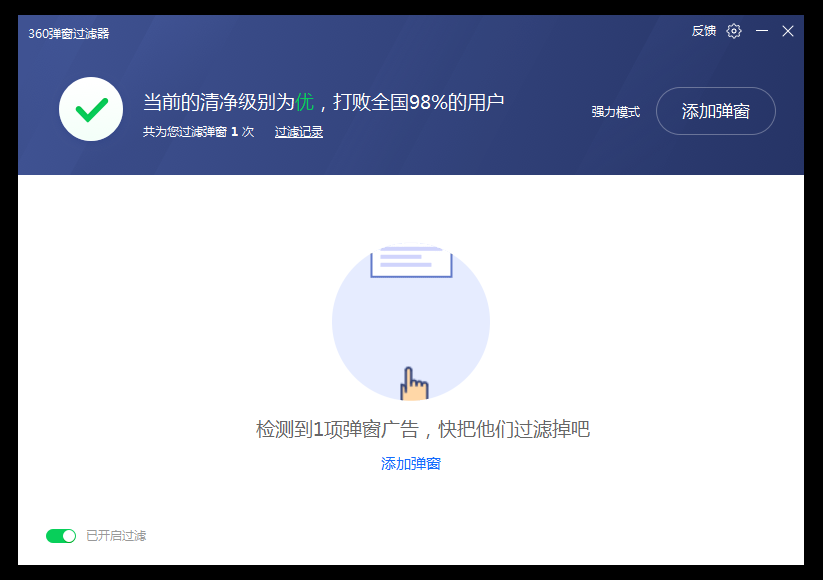 360弹窗拦截器是最新的360安全卫士中提供的弹窗拦截工具,不占资源,功能全面。360弹窗拦截器可以拦截各种应用内置的广告弹窗,效果不错,很实用的日常必备小工具。