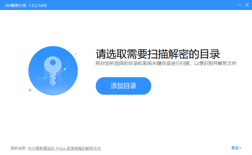 专为勒索病毒推出的文件解密软件。电脑中了勒索病毒怎么办,360解密大师帮您忙,一键破解80多种勒索病毒,免费为中招的用户解密恢复文件。