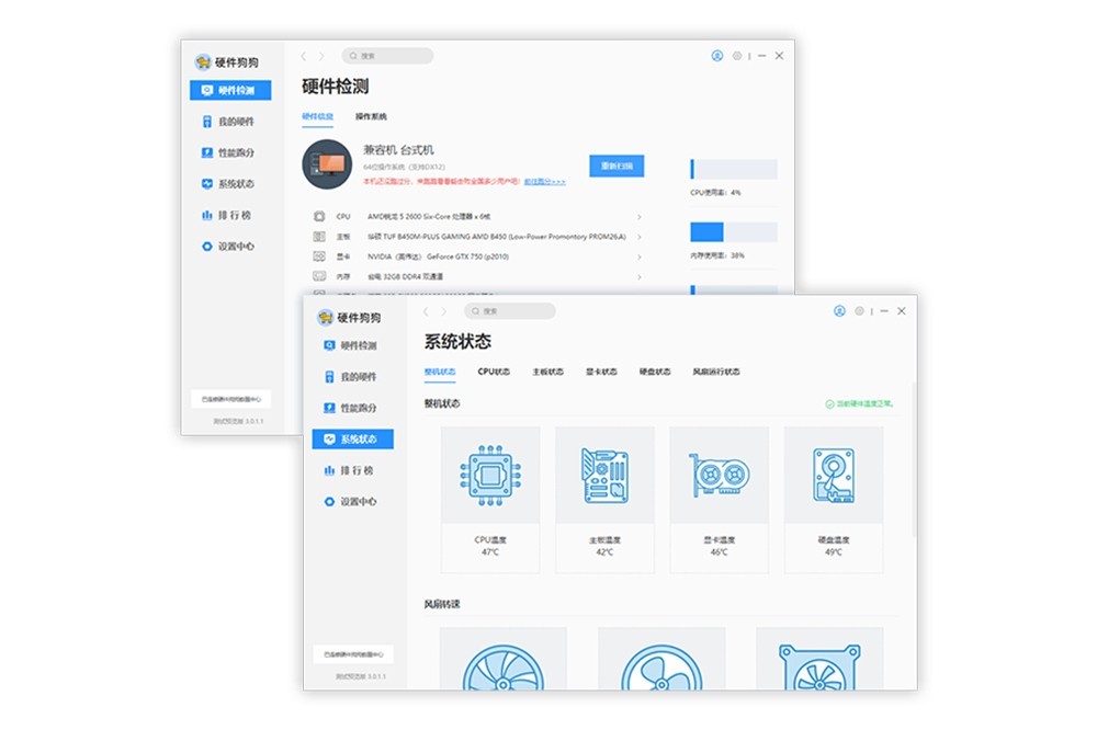 硬件狗狗工具可以让大家快速了解到自己的电脑状况,防患于未然,不至于在关键时刻因电脑罢工而误事。“我的电脑”——电脑概况自动检测,可以让大家对自己的电脑概况了如指掌。“我的硬件”——硬件详情一目了然,适合想了解自己详细硬件信息的朋友。“温度监测”——电脑温度实时监测CPU、显卡、主板、硬盘的温度,让硬件运行状况心中有数。多年资深硬件老编技术支持,20年专业一如既往;内嵌目前最专业的硬件检测内核,精确检测,安全可靠;科技蓝UI轻量简洁,启动迅速,不占资源。
