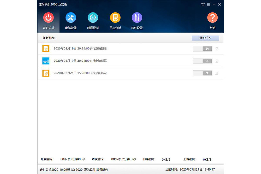 一款专业的电脑定时自动关机软件,具有定时关机、电脑管理、时间限制和开关机日志分析四个强大功能,能够满足各种对电脑定时关机有需求的用户,堪称是家长和电脑管理人员的好帮手