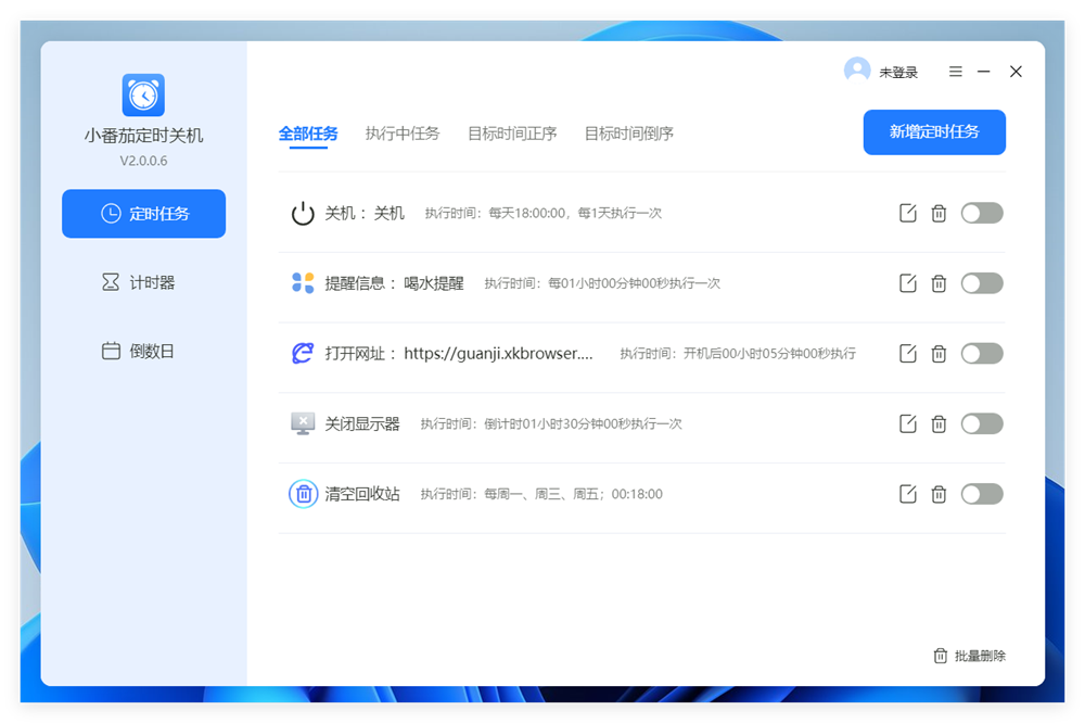 小番茄定时关机是一款高效的电脑定时关机软件,它拥有高效的时间管理功能,是一款学习与办公必备的定时小工具,除了常规的定时任务功能,还支持倒计时,倒数日等功能。小番茄定时关机设置有多种定时任务模式,例如每天定时任务、倒计时任务、间隔定时任务,以及开机启动任务等;定时执行多种动作,比如定时自动关机、定时重启、定时锁定、定时注销、定时睡眠等,同时可以添加更多定时任务:定时关闭和打开程序、定时打开和关闭显示屏、定时清空回收站、定时提醒等。小番茄定时关机支持倒计时模式,以倒计时方式设定程序自动执行指定的操作,是一款轻巧实用的定时关机助手。小番茄定时关机同时支持时执行早睡任务和喝水提醒,帮助用户养成更健康的作息规律。