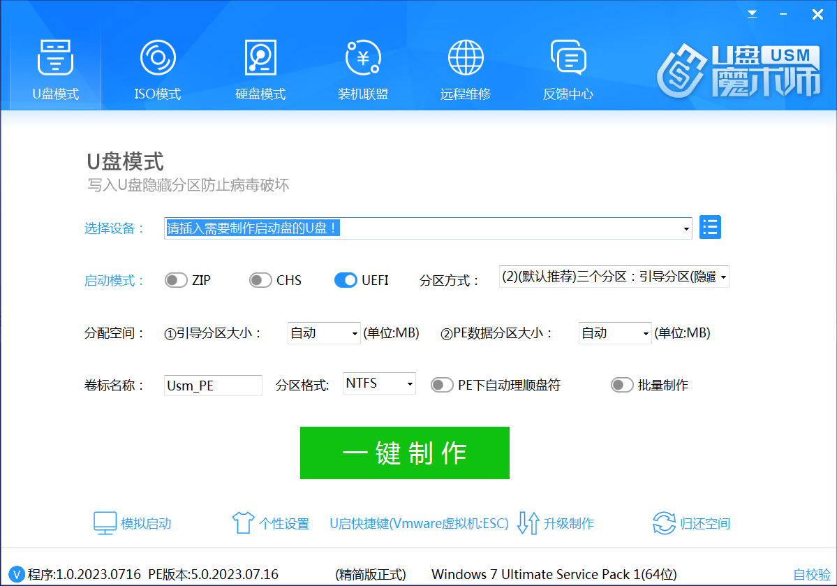 U盘魔术师(简称USM)是一款面对移动设备,光盘设备,本机系统的PE制作工具。能全面支持和适别GHO\WIM\ESD\ISO等各种镜像格式;PE内置的装机工具可以修复大部分系统蓝屏、卡四叶草和引导问题;支持制作本地模式、ISO光盘模式、U盘等移动设备模式;功能全面且自定义强,是装机人员必备工具。