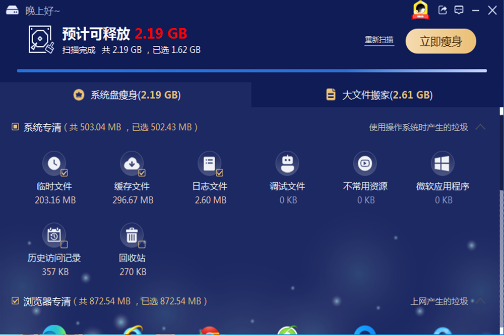 云清系统清理优化大师是一款轻量而强大的系统优化工具,15兆集成了能想到的PC优化功能。系统优化:电脑一键优化加速_电脑问题检测,C盘/全盘清理瘦身,磁盘碎片清理,浏览器缓存清理。系统保护:系统一键全面保护_流氓软件防护,卸载残留清理,流氓弹窗拦截,上网隐私痕迹清理
