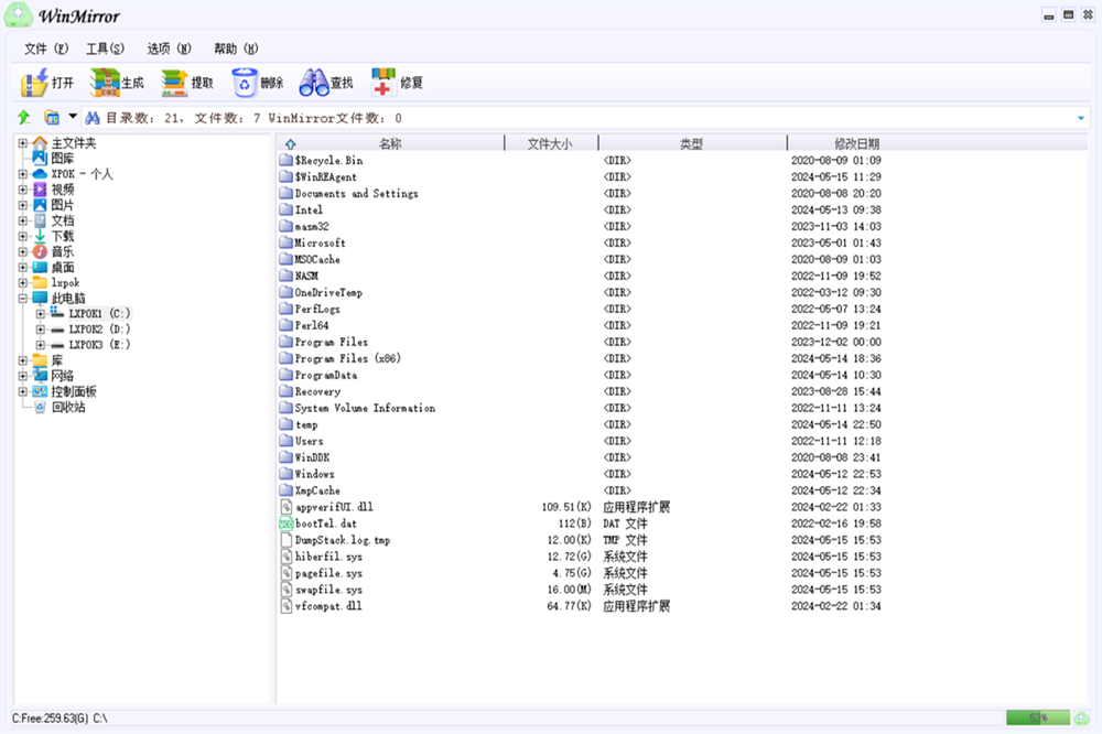 WinMirror是全新构建的划时代数据备份恢复系统,具有受专利保护的独有数据压缩格式,当电脑遭遇黑客、病毒、木马攻击、误操作或者其他灾难事件而发生后,会造成系统无法正常启动或不能正常读取数据,甚至任何恢复软件都无法识别分区文件系统的情况下,利用本产品恢复数据时,可以看到灾难发生前在正常操作系统下一样的分区、 一样的目录项、一样的文件信息,可以根据个人需求进行文件恢复工作,在数据恢复方面大幅简化了传统恢复软件的繁琐操作及数据恢复残缺不全等等短板问题,主要特点:恢复数据更加快速轻巧、兼容性好、更加安全,具有通常恢复软件无法比拟的优势和便利。