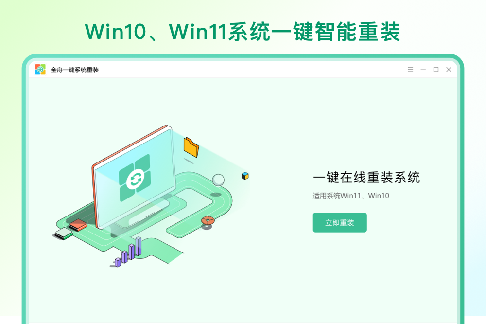 系统重装,系统还原,重装系统,还原系统,一键装机,在线装机,金舟一键系统重装是一款小巧且功能强大的纯净系统装机神器,支持一键重装系统,无需繁琐步骤,即使是电脑小白也能轻松操作,提供Win10、Win11系统的重装还原功能,将系统重装至最流畅状态且纯净无捆绑,还你一台全新电脑的使用体验。