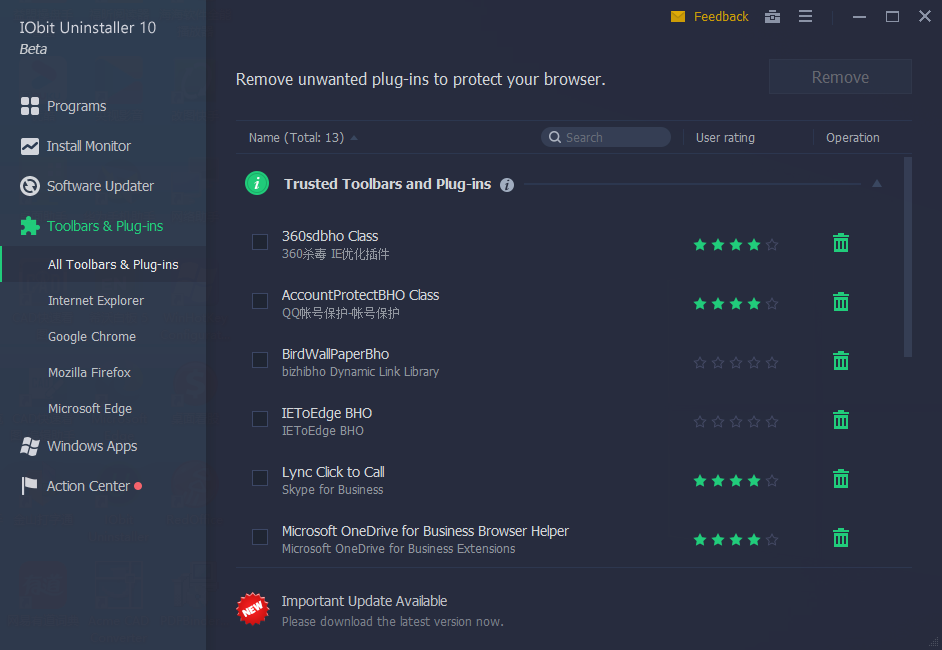 简易快速的软件卸载工具。它提供了标准卸载、高级卸载和强制卸载三种模式,在高级卸载模式下,它会在卸载后极速搜索注册表,找出残余信息并删除,使软件卸载更干净彻底。同时,这款工具人性化地将软件分为工具条、近安装、较少使用、较大程序和windows更新程序等几个类别,使您快速找到想要删除的软件。它还会自动生成一个详细的日志,告诉您近都卸载了哪些程序。