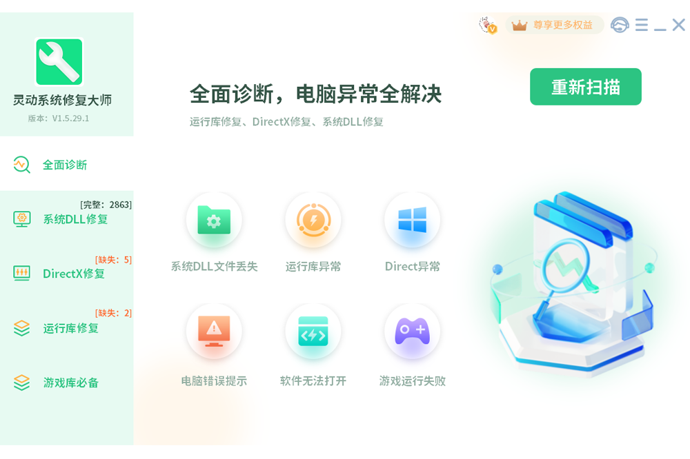 针对系统DLL异常、DirectX错误、微软运行库缺失,一键扫描修复Windows(Win7/Win8/Win10/Win11)系统运行库文件,集成了最新DirectX Redist组件,专注于修复DirectX错误,解决游戏报错、崩溃、软件无法打开等问题,修复异常DLL文件缺失报错问题(如:XINPUT*,DLL、D3DCompilier*.dl、MSVCP*,DLL等),提供安全的微软VC++(2005-2022)、.Net运行库合集(2.0-48)以及OpenAL、MSXML、JavaSE等常用组件高速下载,支持人工远程协助,帮助您进一步解决系统问题。