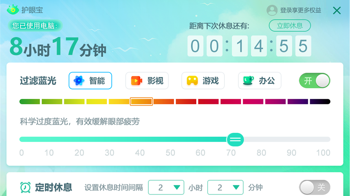 蓝光护眼宝还具备的定时休息提醒功能,让你适当调节工作和生活。