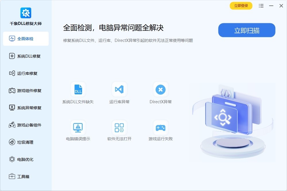 一键智能识别并修复系统DLL缺失、游戏无法运行等问题。支持全面系统库,快速恢复电脑最佳状态。 【全面体检】全面扫描,电脑异常全解决,修复运行库、Directx、系统DLL文件异常引起的应用程序无法正常使用等问题。 【系统DLL修复】解决系统DLL文件异常问题,解决运行游戏或打开应用时提示dll文件缺失或损坏。 【运行库修复】修复系统必备的常用运行库,解决因运行库缺失引起的dll丢失或程序无法运行等问题,包括C++运行库、.NET运行库、游戏库等的下载。 【游戏组件修复】 DirectX异常修复,修复游戏或应用运行故障或显示部分dll丢失引起的故障。 【系统/应用程序错误修复】修复系统或者软件运行产生的错误,解决系统蓝屏、软件崩等问题。