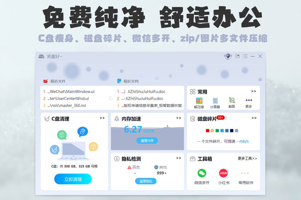 一款【纯净智能】、【操作简单】、【轻便可信赖】的C盘清理软件,小白用户专属。 可一键清理系统垃圾、加速内存、数据恢复、整理文件碎片、清理敏感隐私,保持电脑干净清爽、系统运行流畅。 同时,还提供微信多开、小红书多开、Zip解压缩、图片/视频/PDF等多格式文件压缩、电脑截图、鼠标连点器等多种智能功能,提升办公效率。