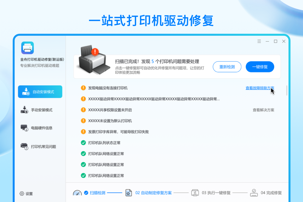 打印机驱动,打印机驱动修复,打印机故障修复,打印机驱动安装,金舟打印机驱动修复软件是一款能够自动识别打印机品牌和型号,将驱动程序安装、打印机异常检测和修复融为一体,一键修复驱动程序的软件工具,让您轻松应对所有与打印机相关的问题,告别打印烦恼,迎接流畅体验!您的一站式打印机驱动管理和修复工具,专为解决日常使用中遇到的各种驱动难题而打造,只需几步操作,即可让您的打印机恢复最佳工作状态。