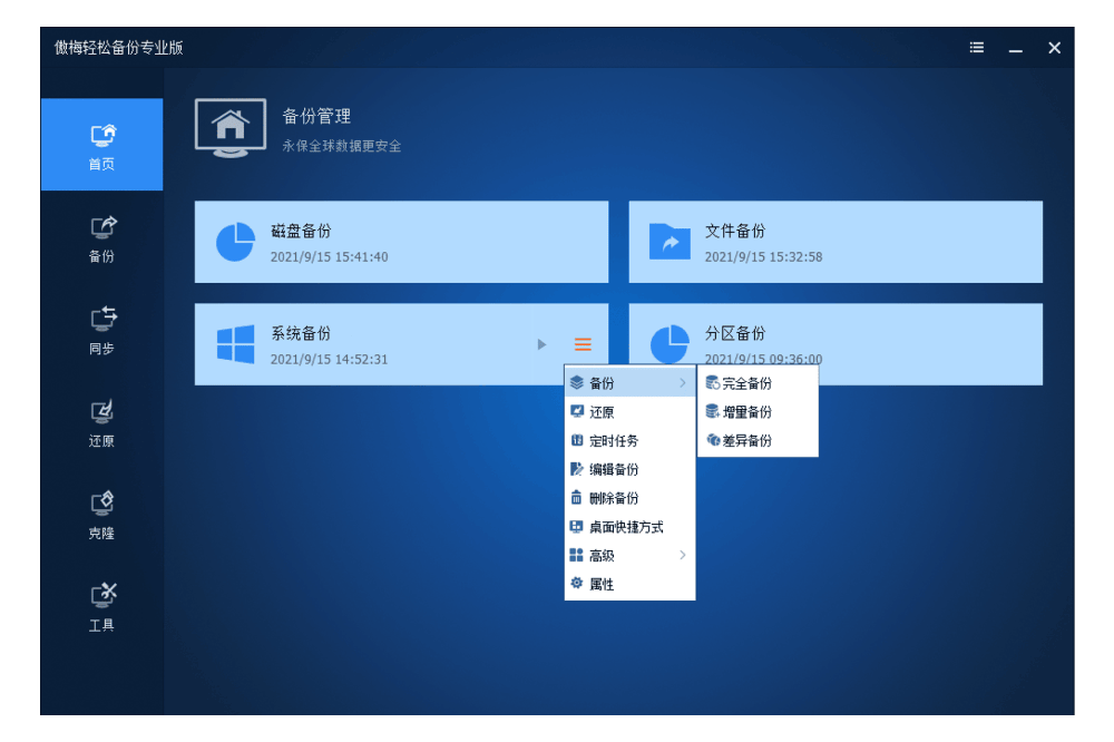 傲梅轻松备份是一款简单易用的数据备份软件,为操作系统创建备份镜像,自动实时同步备份重要文件,可满足装机系统还原、迁移硬盘数据、日常文件备份等多种需求。