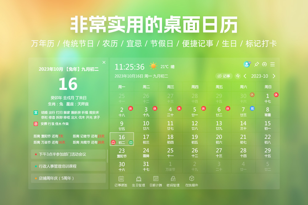 桌面日历/万年历/农历/记事/便签/提醒/生日管理/节假日,专业的桌面日历工具,可方便查看万年历,农历日历查询,以及传统节日。芝麻日历还可以添加记事,桌面便签,备忘录,生日管理,日期计算,密码管理,在线插件,功能非常实用,是一个强大的桌面小助手。 桌面日历:美观的界面,让日历非常完美的融合到桌面上,支持日历界面和日历记事界面; 记事便签:轻松记事管理,让你更有效的管理事情,并结合日历展现记事,方便查看和提醒; 生日管理:可以管理亲人朋友的生日,协助你记住他们的生日,让每一个生日都不错过; 日期计算:计算2个日期的时间差和推算前后日期; 密码管理:密码管理小助手,可以帮你记录密码,方便好用;