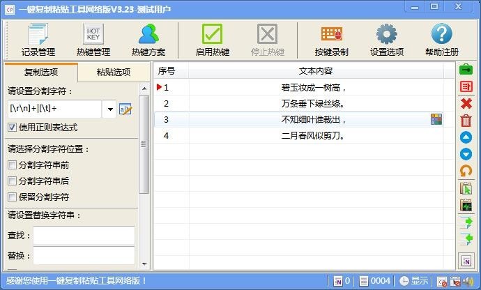 一键复制粘贴工具,是一款强大而实用的系统文字复制、粘贴辅助工具,真正实现了“连续复制,顺序粘贴”的功能;配合丰富的复制粘贴选项和按键录制功能,让您达到事半功倍的效果。只需简单几步,就能完成原本繁琐复杂的文字录入粘贴工作。