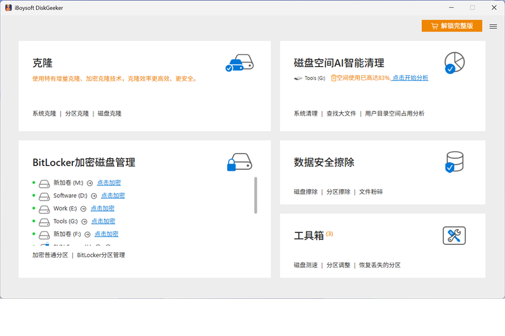 赤友DiskGeeker 是一款专业的 Windows 磁盘管理软件,提供磁盘克隆、分区恢复、BitLocker 加密、磁盘空间AI智能分析、数据擦除 等功能。该软件适用于 数据备份(支持 增量备份和全盘备份)并能帮助用户 恢复丢失的分区 或 删除的文件,确保 磁盘高效运行。 赤友DiskGeeker 还具备磁盘速度测试、分区调整大小等实用工具,适用于 个人和企业用户。 凭借易用性和强大功能,是磁盘管理、数据加密、数据备份、数据恢复的理想选择。