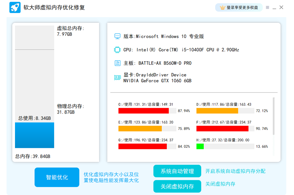 智能优化修复电脑系统的虚拟内存不足和报错问题,自动计算调整电脑最佳虚拟内存,并且支持一键开启系统自带的虚拟内存管理以及关闭虚拟内存。