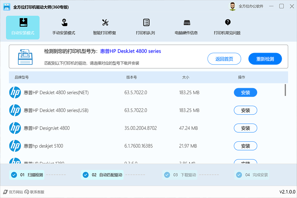 打印机驱动,打印机驱动修复,打印机故障修复,打印机驱动安装,打印修复,打印机设置 全方位打印机驱动大师软件是一款能够自动识别打印机品牌和型号,将驱动程序安装、打印机异常检测和修复融为一体,一键修复驱动程序的软件工具,让您轻松应对所有与打印机相关的问题,告别打印烦恼,迎接流畅体验!您的一站式打印机驱动管理和修复工具,专为解决日常使用中遇到的各种驱动难题而打造,只需几步操作,即可让您的打印机恢复最佳工作状态。 【功能特点】 一键智能修复:采用先进的扫描技术,能够快速识别您系统中安装的所有打印机,并自动检测出任何可能存在的驱动程序问题。一键修复,确保您的打印机以最佳状态运行。 驱动下载安装:内置庞大的驱动数据库,涵盖几乎所有主流品牌的打印机。下载最新版本驱动,并帮您完成安装流程,安装合适驱动程序再也不是难题。 易懂教程与支持:内置详尽的帮助文档,包括图文并茂的操作指南以及解决常见问题的步骤。无论您是初学者还是有经验的用户,在遇到任何关于打印机驱动的问题时,都可以通过我们的教程找到快速有效的解决方案。