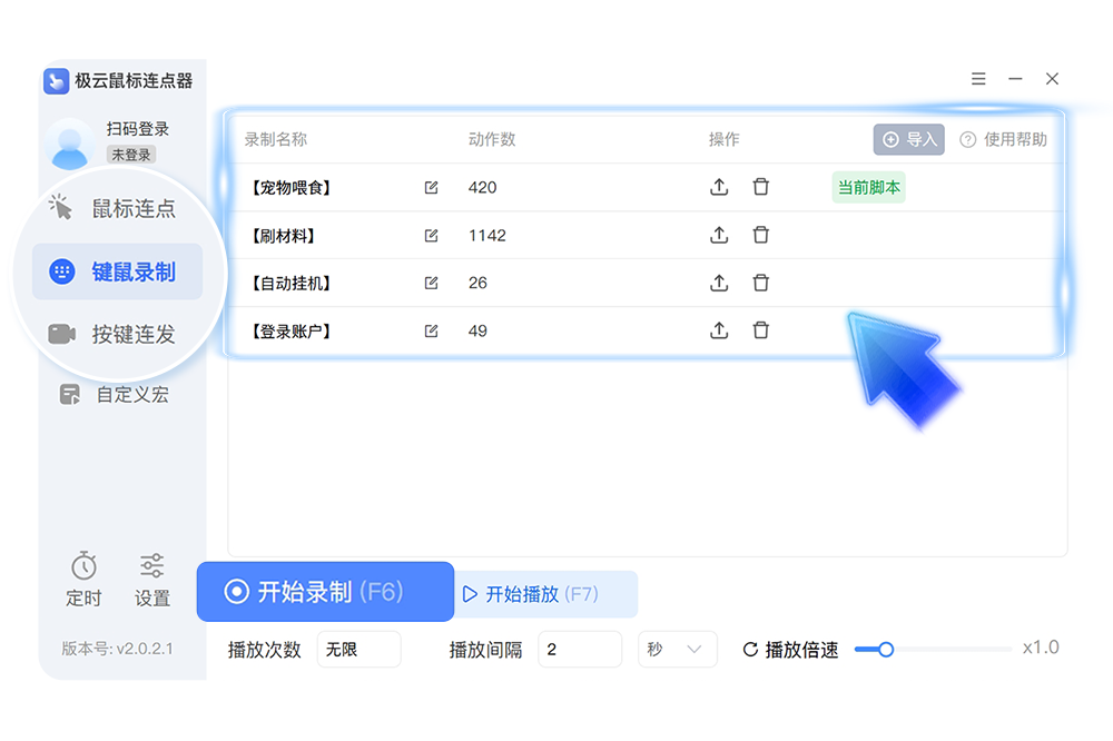 极云鼠标连点器是一款用于模拟键鼠操作的软件,支持鼠标左右键及中键点击,满足不同需求,点击事件多样性,可以实现鼠标每秒快速点击1000次,精度高更稳定;同时还支持鼠标键盘录制,自动循环回放,让游戏挂机不是梦,彻底解放双手。界面操作简单,功能高效稳定。