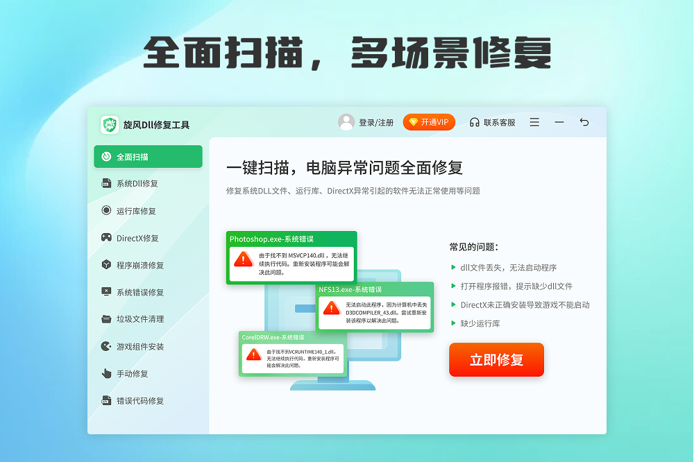 旋风DLL修复工具是一款专业的DLL文件修复工具,用户可以一键扫描并修复DLL文件,为用户解决因DLL缺失导致应用程序无法启动、报错,系统提示找不到DLL文件或文件损坏,游戏启动崩溃、黑屏或提示错误等问题。