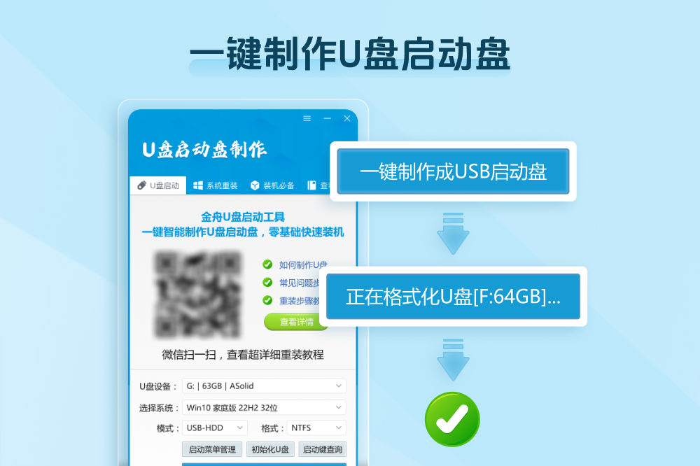 U盘启动盘制作,U盘启动工具,USB启动盘创建,启动盘生成,生成启动盘,一键制作U盘启动盘,U盘启动盘制作工具,U盘启动盘制作工具-金舟是一款轻量高效的启动盘制作工具,支持一键制作U盘启动盘,无需复杂技术操作,电脑新手也能轻松驾驭,提供适配 Win7、Win10、Win11的启动盘制作功能,制作后的启动盘纯净无捆绑,助你轻松应对系统安装与维护,畅享便捷的电脑使用体验。 【功能特点】 1、一键智能制作无需专业知识,无需复杂设置,插入U盘点击一键制作,零基础也能快速完成启动盘制作。2、自动环境检测智能扫描U盘和电脑环境,提前预判制作风险,保障启动盘制作安全可靠。3、极速生成启动采用高效制作算法,流程精简,快速完成U盘启动盘制作。4、不带捆绑程软件 制作的启动盘不含任何第三方捆绑程序、插件和广告,使用更纯净。