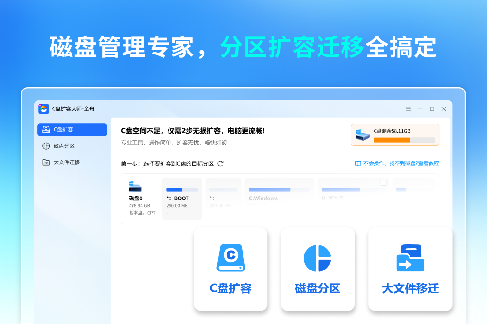 C盘扩容,磁盘分区,磁盘管理,分区助手,分区管理,还在为C盘爆满、系统卡顿而烦恼吗?C盘扩容大师-金舟 - 您的智能磁盘空间管家,运用先进AI算法,为您提供智能、安全、高效的磁盘管理解决方案,彻底告别空间不足的困扰! 核心功能: AI智能C盘扩容: 一键解决C盘空间告急!AI深度分析磁盘使用情况,智能推荐最佳扩容方案,精准调整分区大小,无损数据安全,瞬间释放宝贵空间,让系统运行重获流畅。 灵活磁盘分区管理: 轻松创建、合并、拆分、格式化分区。无论是为新系统准备空间,还是优化存储结构,都能智能规划分区布局,让您的磁盘空间分配更合理、管理更高效。 大文件智能迁移: 精准识别占用C盘空间的大型文件(如游戏、视频、下载内容),智能推荐迁移路径。一键安全迁移至其他分区,有效释放C盘压力,同时保证文件完整性和访问便捷性。 为什么选择C盘扩容大师-金舟? AI驱动,决策精准: 告别手动计算的复杂与风险,AI算法为您提供最优分区与扩容策略。 操作极简,安全无忧: 界面直观,步骤清晰,即使是电脑新手也能轻松上手。严格保障数据安全,操作过程稳定可靠。