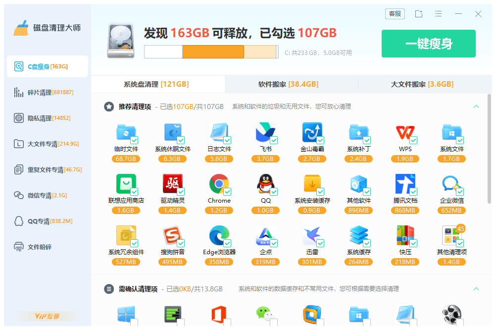 专业的C盘清理工具,当您的C盘空间爆红,电脑运行卡慢时,磁盘清理大师能为您提供一站式解决方案。软件集成了C盘瘦身、大文件/重复文件清理、碎片清理等核心功能,能帮您轻松进行电脑清理,释放宝贵的磁盘空间、加速电脑运行 【核心功能】 C盘瘦身清理:智能扫描并分类系统缓存、软件残留与无用文件。支持一键清理垃圾,更能将大型软件安全地进行C盘搬家,从根源上解决C盘空间不足的问题 全盘空间清理:精准的磁盘扫描引擎,能快速定位并清理隐藏在硬盘深处的大文件和重复文件。更内置微信/QQ专清功能,深度清理聊天缓存,防止社交软件过度占用存储 磁盘碎片清理:通过减少磁盘碎片提升磁盘空间利用率,从而提升磁盘读写效率与速度