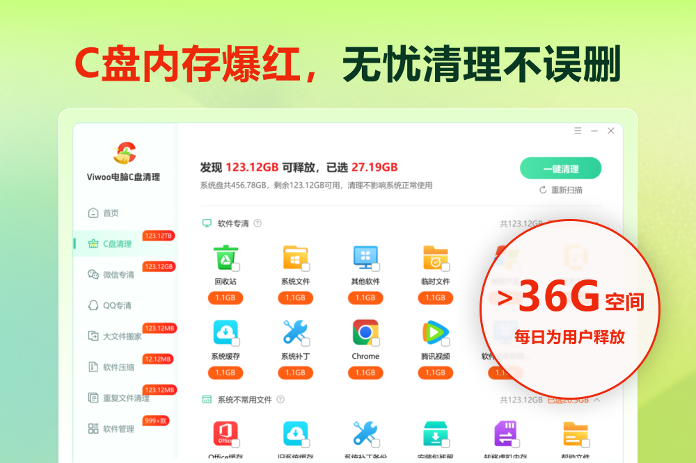 C盘清理,C盘瘦身,磁盘瘦身,释放C盘空间,解决C盘爆红问题,大文件搬家,微信内存专清,QQ内存专清,重复文件清理,软件压缩,电脑优化大师,Viwoo电脑C盘清理是一款安全、高效、强大的系统优化工具软件,致力于为用户提供全面而便捷的电脑管理解决方案。软件集合了磁盘深度清理、智能加速、大文件搬家、微信/QQ专清、重复文件清理、软件管理等功能于一体,可以帮用户轻松清理系统垃圾、管理大文件、清理聊天隐私,提高系统性能,让电脑时刻保持流畅如新。