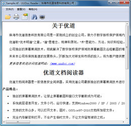 一款阅读禁截屏、禁拷贝、防泄密PDF、文本、文档、图片的信息安全阅读器。它采用优道公司全新独创的屏幕黑洞技术进行开发,查看经优道文档保护器(UUDocProtector)加密转换生成后缀扩展名为.DRM的文件。