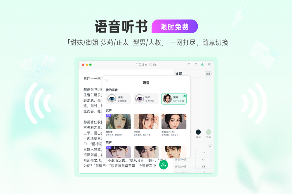 • 「声音」多种声音任意切换,阅读氛围全覆盖