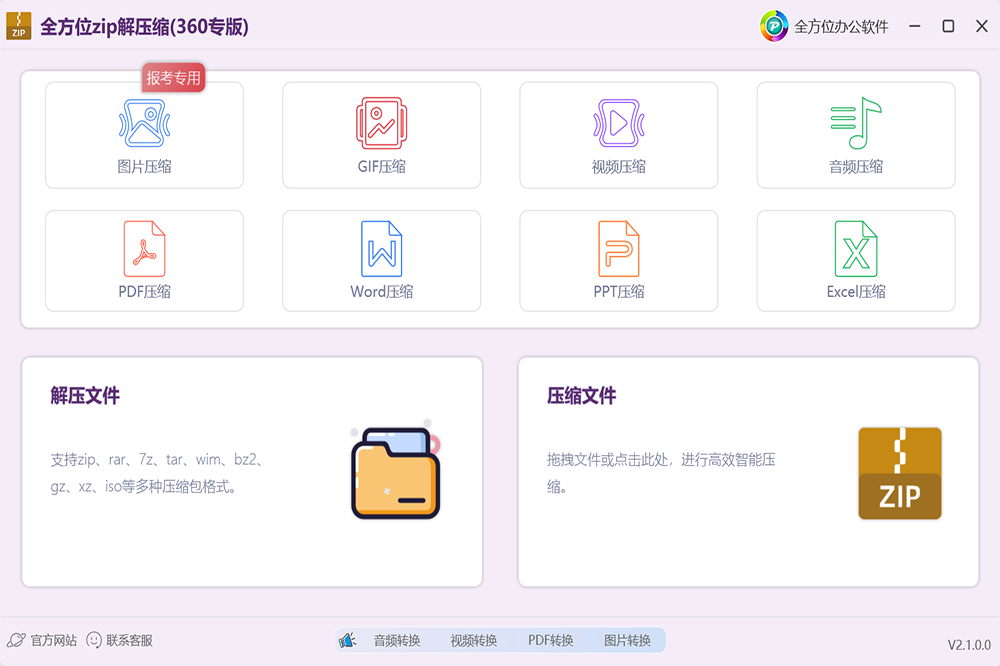 拥有免费解压缩,纯净无广告功能全面的文件解压缩软件 图片压缩,GIF压缩,视频压缩,音频压缩,PDF压缩,Word压缩,PPT压缩,Excel压缩。支持视频格式包含:MP4,AVI,FLV,MOV,MKV;支持图片格式包含:JPG,PNG,BMP,GIF;支持Word格式:Doc,Docx;支持PPT格式:PPT,PPTX。支持Excel格式:Xls,Xlsx。 支持视频压缩,音频压缩,图片压缩,GIF压缩,PDF压缩,Word压缩,PPT压缩,Excel压缩等。支持批量压缩,可同时压缩多个不同的文件;视频压缩支持格式包含:avi、wmv、mpg、3gp、mp4、mov、flv、mkv等;图片压缩支持格式包含:Gif、png、jpg、jpeg、jpe、bmp、tif等;文件压缩支持格式包含:pdf、docx、pptx、xlsx等 支持解压缩成:Rar,Zip,7z,bz2,bzip2,tab2,gz,gzip,tgz,tar,xz,txz、tbz2、xpi、zipx、tgz、tpz、txz、swm、lha、lzma86、img、bz、split、tbz、taz、deb、war、chm